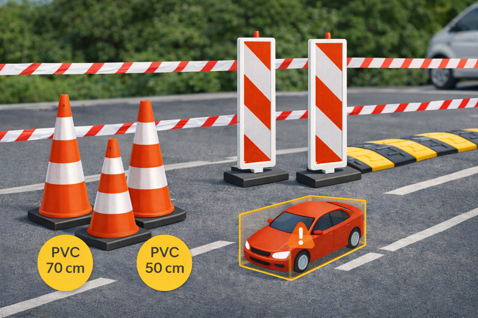 Cônes PVC 50/70 cm, balises K5D, séparateurs de voie, rubalise.
