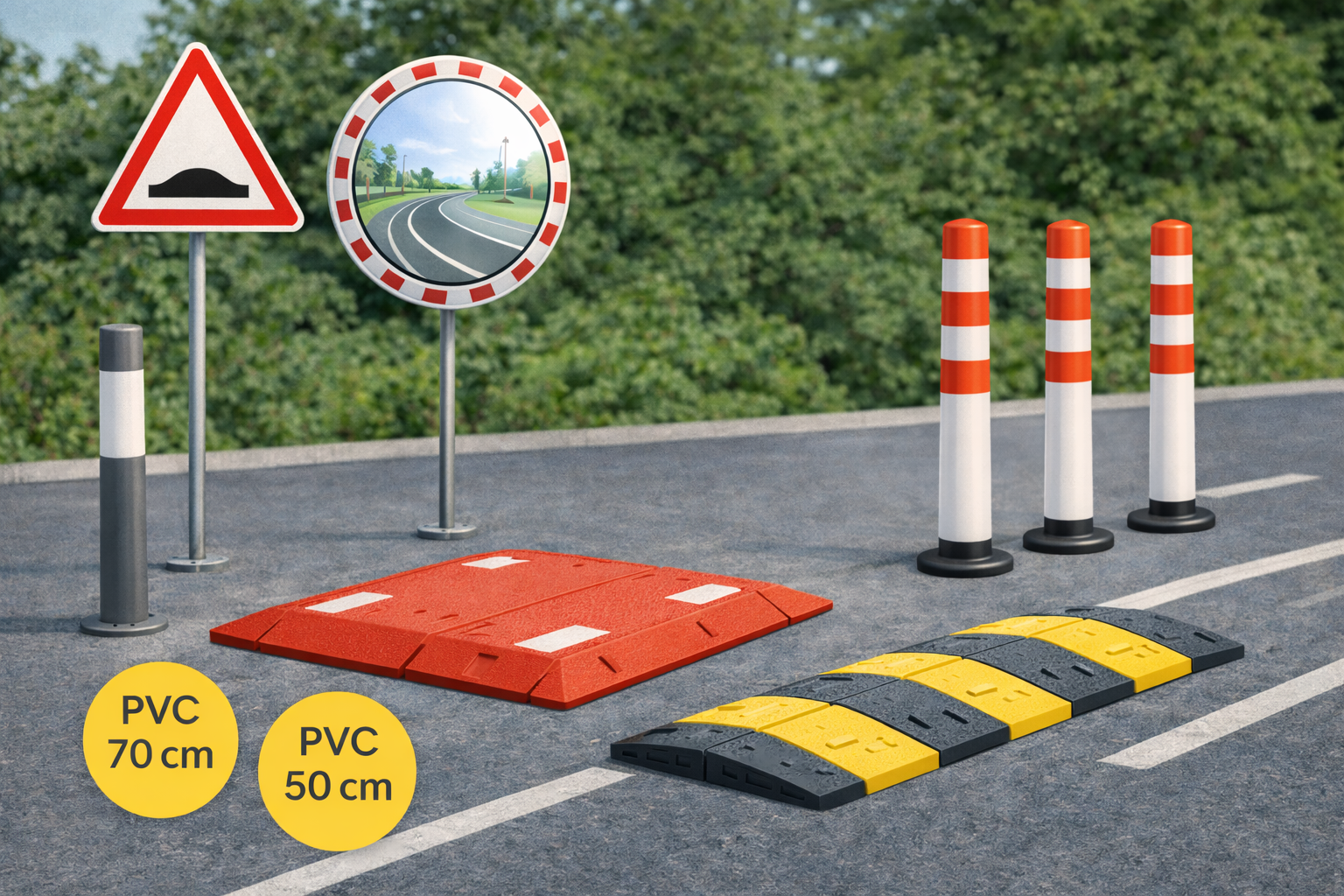 Coussins berlinois, ralentisseurs modulaires, miroirs & bornes.